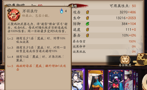 三技能和大岳丸一样,4火技能,不过是随机单体6段,根据叠加的麓威效果有不同的附加效果。10层麓威时大招不再消耗麓威。同时每层麓威附带10%的吸血效果,5层以上麓威对重复目标伤害逐次递增10%,每层麓威额外附加一段伤害,也就是大招最多有15段伤害。然而要知道铃鹿御前需要放一次二技能才有麓威,实在过于慢热。强度目前来看实在不高,肯定是需要一波打加强的。