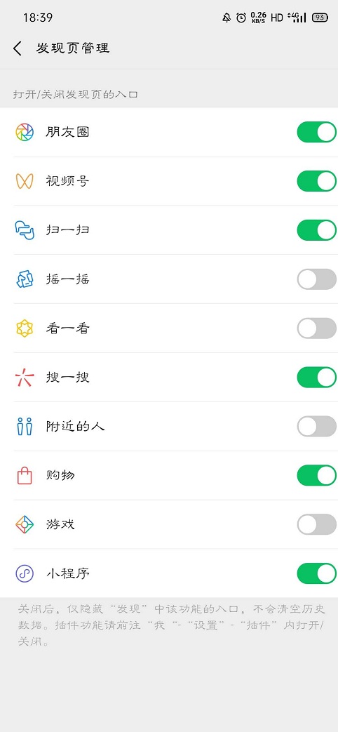 在这里管理发现按钮下的所有功能,选择打开或者关闭。觉得视频号的小红点太烦的话,就把这个功能屏蔽即可。