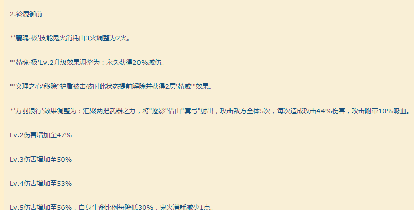 二技能的火耗由三火变为二火,同时二技能的LV2的技能效果由伤害增幅变成了铃鹿御前永久获得20%减伤。其中义理之心的效果公告描述有误,体验服的实装技能效果为,护盾被击破时提前解除义理之心,并且不在获得麓威。