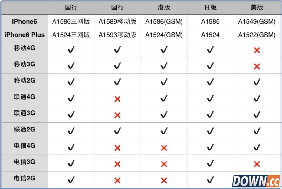 A1589:为移动定制版iPhone6,支持TD-LTE、TD-SCDMA、GSM,漫游支持WCDMA以及FDD LTE。