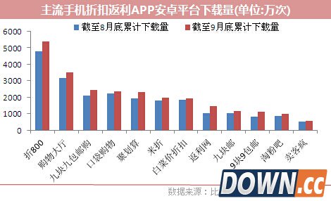 日前,比达咨询(BigData)数据中心对国内主流的折扣返利APP在国内九大主流安卓平台(包括百度手机助手、360手机助手、应用宝、91助手、安卓市场、豌豆荚、安智市场等)上的下载量进行了监测,数据显示,截至9月底,折800以5367.6万次的总下载量位居首位,购物大厅、九块九包邮购分别以3502.94万次、2420.23万次位居第二、三位。口袋购物以微弱差距屈居第四位,其总下载量为2353.23万次。紧随其后的依次是聚划算、米折、白菜价折扣、返利网、九块邮、9块9包邮、淘粉吧和卖客疯。
