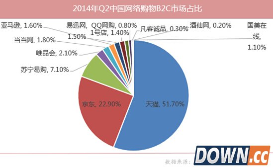 在国内主流的B2C厂商中,天猫市场以51.7%的市场份额占据首位,京东商城以22.9%占比位居第二,第三名是苏宁易购,占比7.1%。
