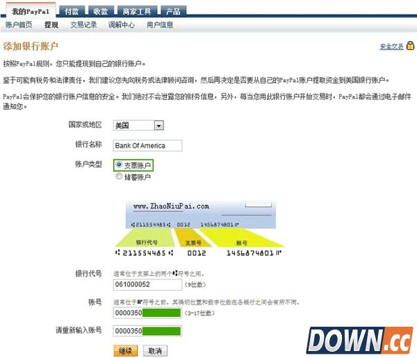 首次提现,先要添加美国银行账户。翻开申请Payoneer卡时收到的美国支付服务验证邮件(或打开【Payoneer中文官网】-收取资金-美国支付档案),可以找到美国支付服务信息――国家或地区选“美国”,银行名称很多都是“First Century Bank”的,酷易网(www.cr173.com)填的是“Bank Of America”,账户类型选“支票账户”(CHECKING),银行代号(即ABA代码/银行识别码/汇款路线)是9位数字,账号一定要填17位美国银行账号(不是16位Payoneer万事达预付卡号),填好继续。
