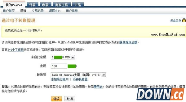 从PayPal提现到美国银行账户需要3到4个工作日来完成,实际所需时间取决于银行(我是11号傍晚申请的,13号晚上就收到邮件说P卡已充入资金)。如果银行信息有误,则提现款项会被退回PayPal并加收手续费,银行那边可能还会收手续费。PS:已经发现好几个流氓,直接盗用我的Payoneer教程,不注明出处也就算了,还抹掉图片里的网址和zhaoniupai的个人信息。