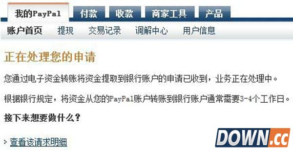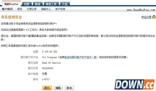 从PayPal提现到美国银行账户的交易明细,无手续费