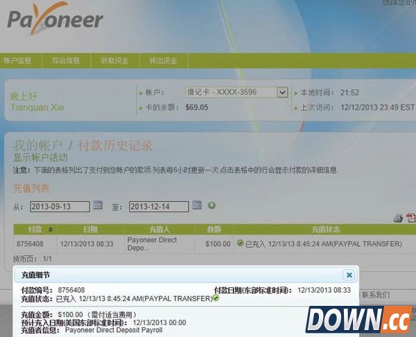 首次从PayPal提现100刀到美国银行账户,再自动转入Payoneer万事达预付卡后就只剩69.05刀了