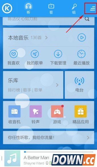 1.打开手机酷狗音乐,点击右上角的【菜单】标志