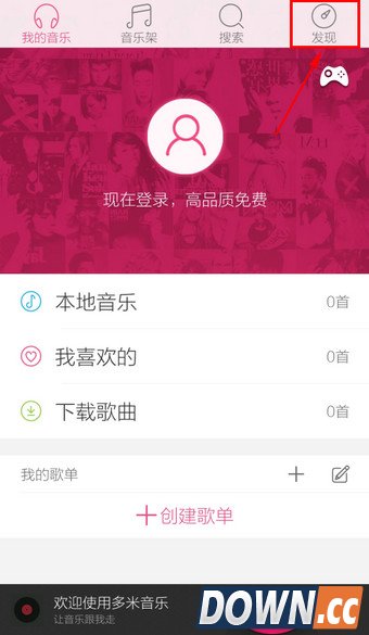 1.打开手机多米音乐,选择右上角的【发现】