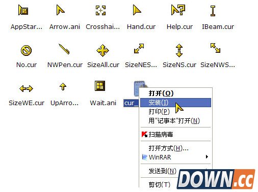 方案二:大家要是遇到压缩包中里没有 .inf 的安装文件,只是单个的.cur 或者.ani的鼠标文件我们就只能手动替换了