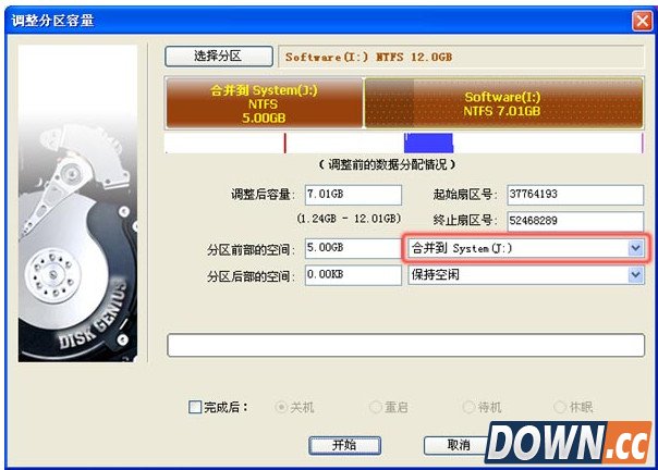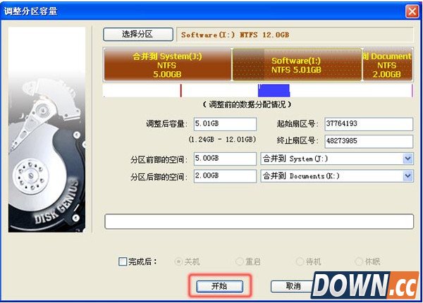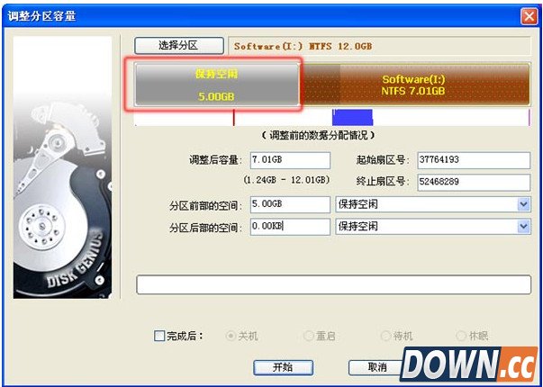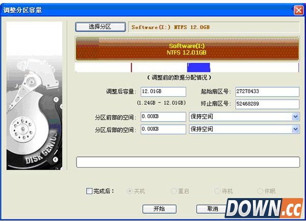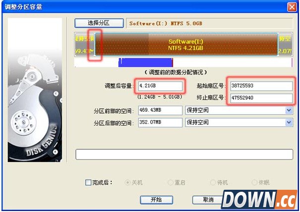2、调整分区大小时,DiskGenius支持鼠标操作,可以用鼠标改变分区大小,移动分区位置,切换调整后空间的处理选项等;也可以直接指定调整后的分区大小,对于有特殊要求的用户,还可以设置准确的起始与终止扇区号,如下图: