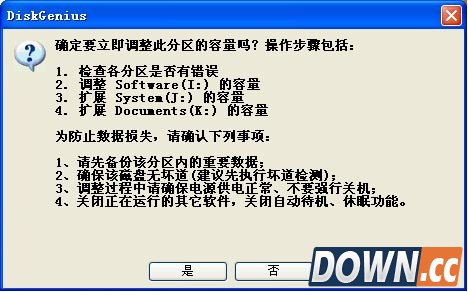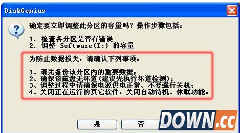 DiskGenius在开始分区调整操作时,也会提示您这一点,如下图: