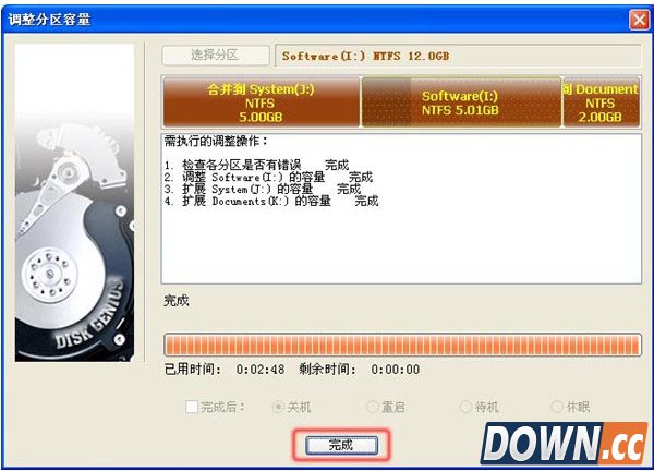 5、调整分区结束后,点击“完成”按钮,关闭调整分区容量对话框,如下图: