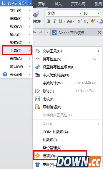 1、首先打开wps,选择wps文字--选项,进入设置页面或者点击下拉“工具”选择“选项”