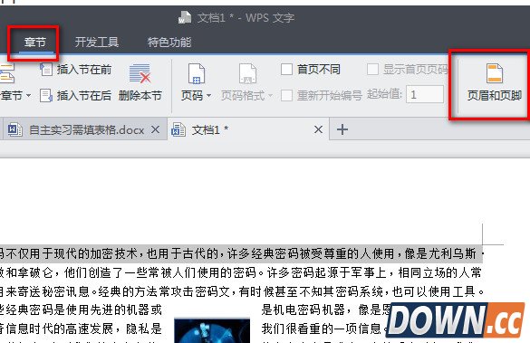 1、首先我们打开文档,输入你想要设置页面页脚的文字,点击“章节”菜单--选择“页眉和页脚”,整片文档进入页眉页脚编辑模式。