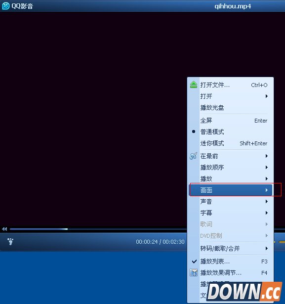 1、用qq影音打开视频,鼠标移动到视频画面上方,点击鼠标右键,选择【画面】