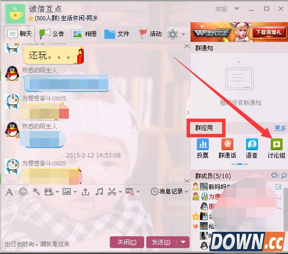 5、如果您想在群中创建讨论组,也是可以的。首先进入到群聊天页面。在群应用中找到讨论组,点击它