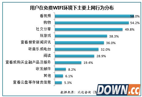 从用户在免费WIFI下的上网行为来看,看视频、购物、社交分享位列前三,分别占58.0%、54.2%、49.8%;玩游戏、查看搜索新闻资讯、听音乐或电台的用户也均超过30%。可见用户在使用免费WIFI时更侧重于在线时长较长的休闲娱乐。