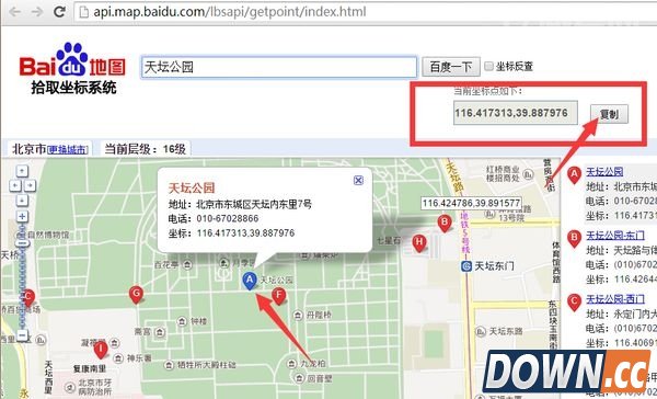 输入“天坛公园”,然后“百度一下”。在点击坐标右边的“复制”按钮就可以了。