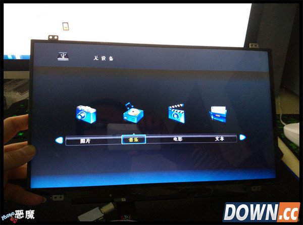 连接方法很简单,连接上屏线即可,点击开机。默认进入的是U盘模式。14寸的大号MP4还是很不错的