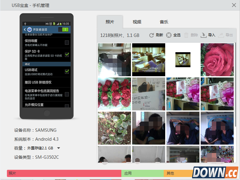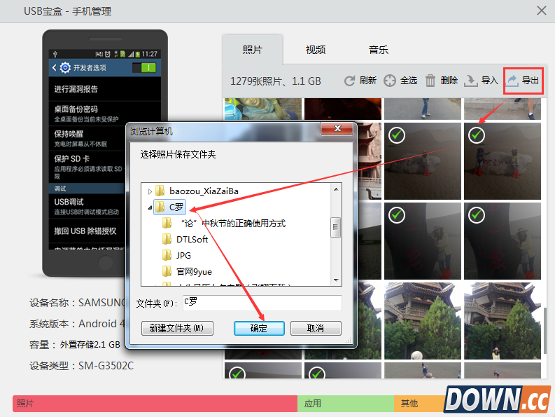 虽然现在的智能手机存储容量不断增大,但仍受限于移动设备体积大小等因素,大部分用户对手机的内存需求还是相当大的。内存不够。但是又不想删除手机里的图片怎么办呢?USB宝盒为用户提供了PC连接手机的方式,实现快捷备份转移图片。您只需一键勾选您需要转移的图片,点击导出,然后再选择导出到电脑那个文件夹中即可。