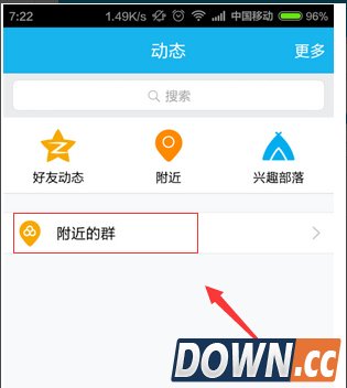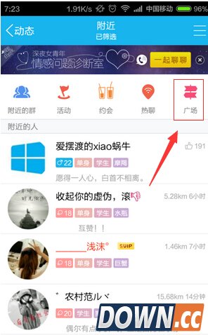 在动态页面中,点击页面最上方的“附近”按钮,进入附近平台页面,在附近页面中,我们可以看到有一个广场页面,点击进入广场。