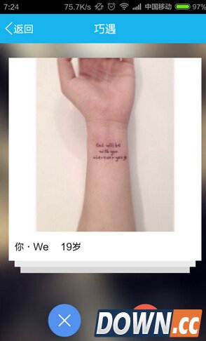 如果你对其中的某一个用户有好感,那么点击爱心图标,如果对方恰好也点击了爱心图标,那么恭喜你,你们将进入一个聊天界面,这便是巧遇的入口,如果你点击的是左边的叉号,那么将会展现出下一个用户。