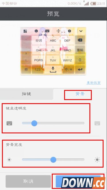 3、选择好自己想要设置为皮肤的图片,然后我们可以调整一下按键中的字体颜色和按键样式,调整一下背景选择自己想要的透明度以及背景的亮度