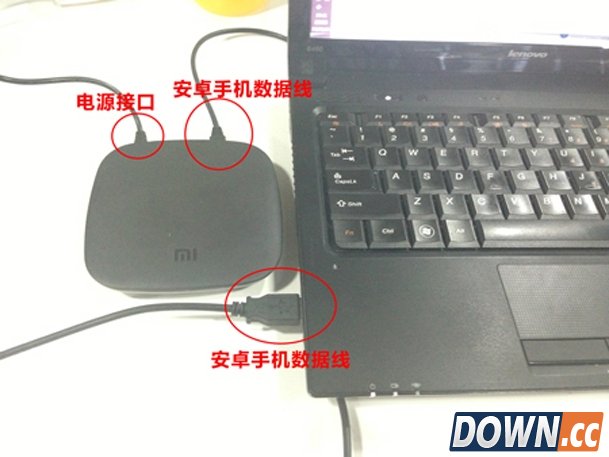 第二步:将小米盒子插上电源(重要,否则电脑无法识别),并用USB数据线将小米盒子连接到电脑。