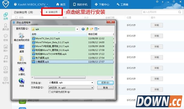 3、点击安装应用,将需要安装的第三方应用安装进小米盒子。
