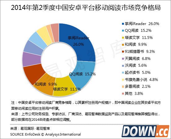 正是!还是易观智库 发布的《2014年第2季度中国安卓平台移动阅读 市场竞争格局》,掌阅仍以明显优势占据了市场的第一。俗话说攻城容易守城难,掌阅新加入了语音朗读功能和社交分享功能,相较上个季度又有所增加,继续领跑。