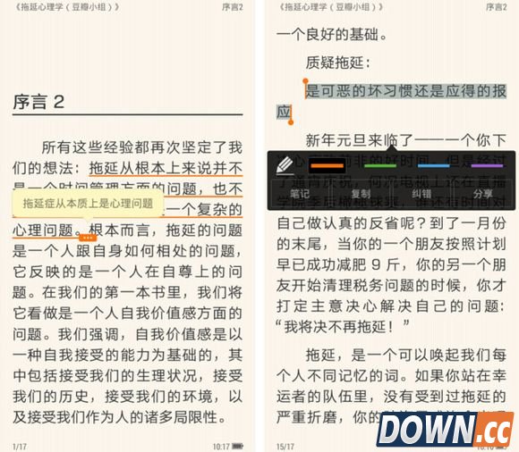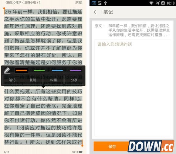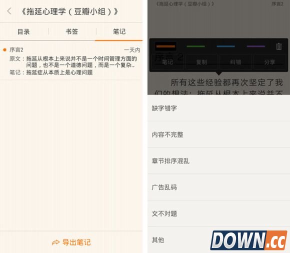 文字内容较为朴素,简单地区分了标题和正文。在阅读时可以通过长按选择内容进行添加读书笔记、复制、纠错和分享的操作。