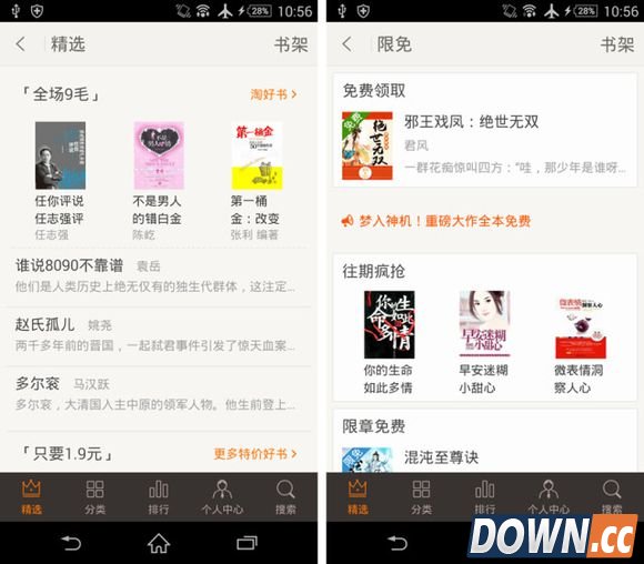 测试期间(10月13日),掌阅的专题和分类标签大部分以促销型为主,首页滚动三个图片滚动推荐位,有两个以“免费”为关键字,还有一个是“0元购”,如果不是点进去看个究竟,倒是很难知道这三个专题的区别(吐槽)…
