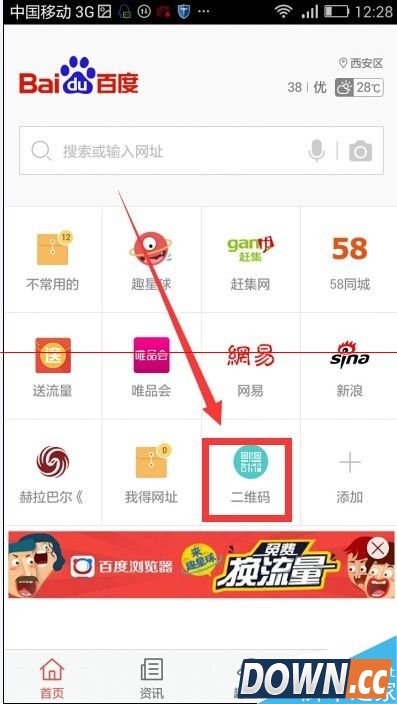 3、可以看到 在百度浏览器首页已经有二维码这个应用的标志了 点按二维码应用标志