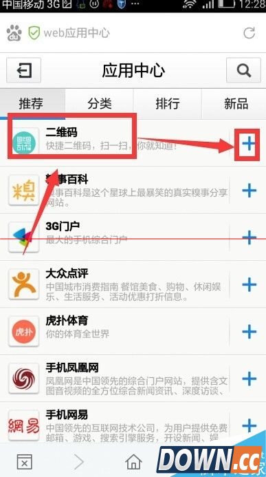 2、在应用中心的推荐选项卡下找到二维码标志 点按该标志即可将二维码应用添加到百度浏览器首页