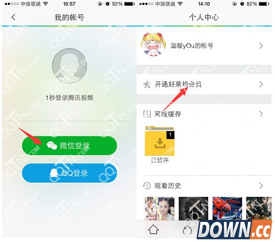 1、首先在腾讯视频客户端上找到个人中心,使用微信登录,点击开通好莱坞会员;