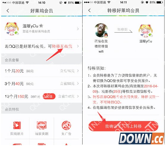 2、在开通好莱坞会员上方我们可以看到提醒,如果QQ已是好莱坞会员可以转移至微信,点击后,选择QQ账号,转移须知大家必须得看清楚,别到时候说QQ为什么享受不到好莱坞会员,如果没意见的话,确认转移。