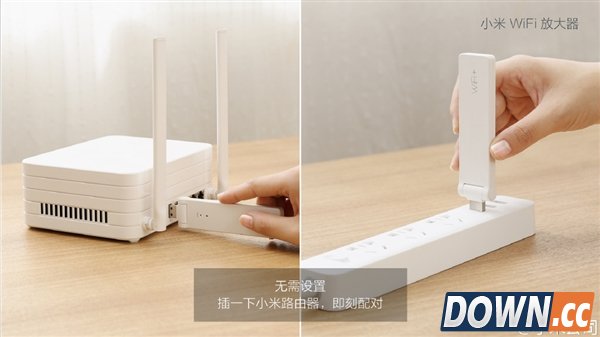 用户无需设置,只要将Wi-Fi放大器插一下小米全新路由器,即可自动配对,然后将小米Wi-Fi放大器连接到USB接口供电,即可将将Wi-Fi信号扩容一倍。