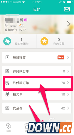 1、手机上面登录美团客户端,然后选择我的,再点击已付款订单。