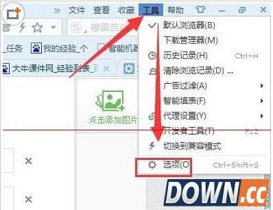 1、打开搜狗浏览器,点击页面右上方的工具按钮,同时选择“选项”。