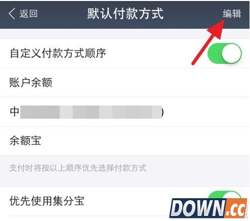 6、就可以看到自己的支付宝的支付方式,点击右上角的【编辑】