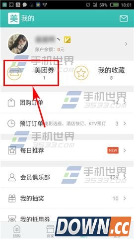 1)去到电影院后打开美团,点击下方导航栏的【我的】,进入到个人中心页面点击【美团劵】。(如下图)