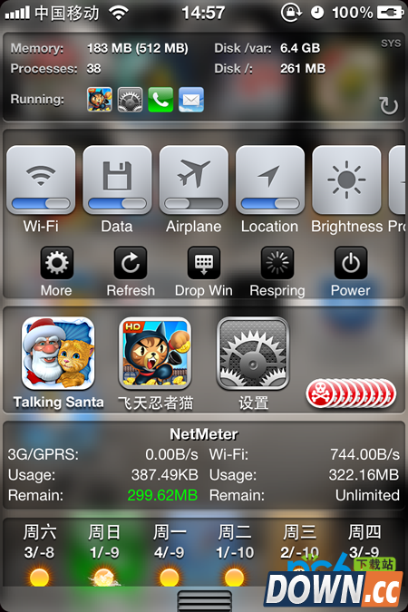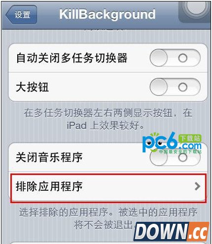 3.程序过滤(选择过滤的程序即使点击一键关闭也不会把它关闭掉)我这边选择cydia为过滤程序,然后点击关闭cydia还是显示在多任务栏中