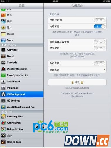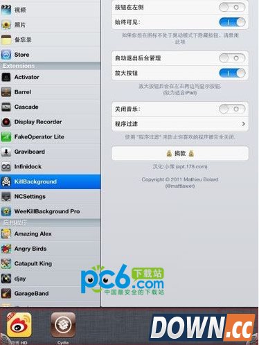 1.首先打开cydia搜索Killbackground下载安装(小编我下载的是178源的,也有汉化补丁,可以一起下载)下载完成后打开设置-Killbackground