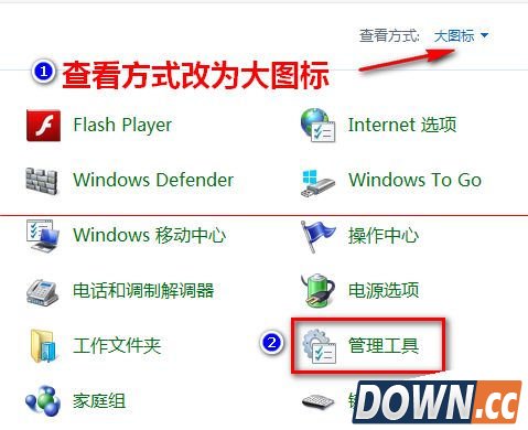 1、打开“控制面板”,将查看方式改为大图标,然后点击“管理工具”。