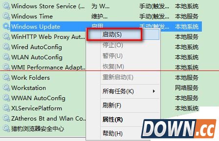 1、按照第一步的方法,找到“Windows Update”服务,右击选择”启动“。