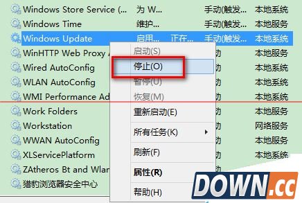3、在“Windows Update”服务上右击,然后单击“停止”。
