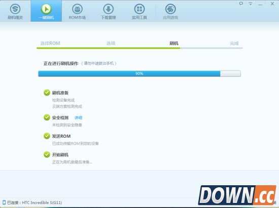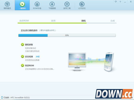 然后点击一键刷机,其中你可以选择勾选或者不勾选清除数据或者备份。进入自动刷机状态,首先的过程是推送Rom到内存卡(所以请确保你的机子已经放置内存卡并且有足够的剩余空间)
