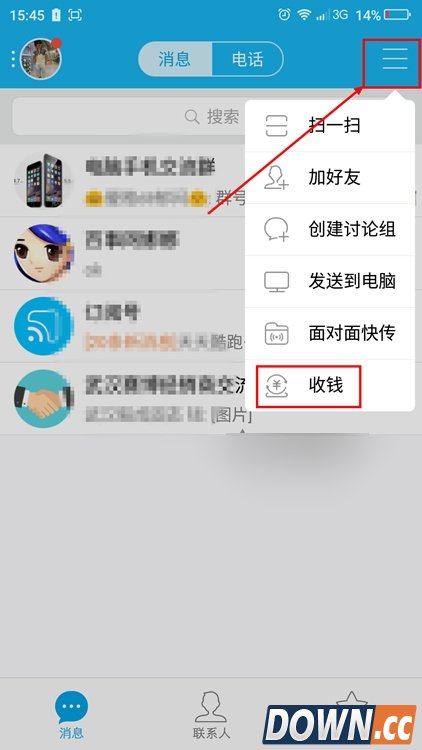 1、首先打开手机QQ,点击右上角箭头所指的位置,并点击收钱。